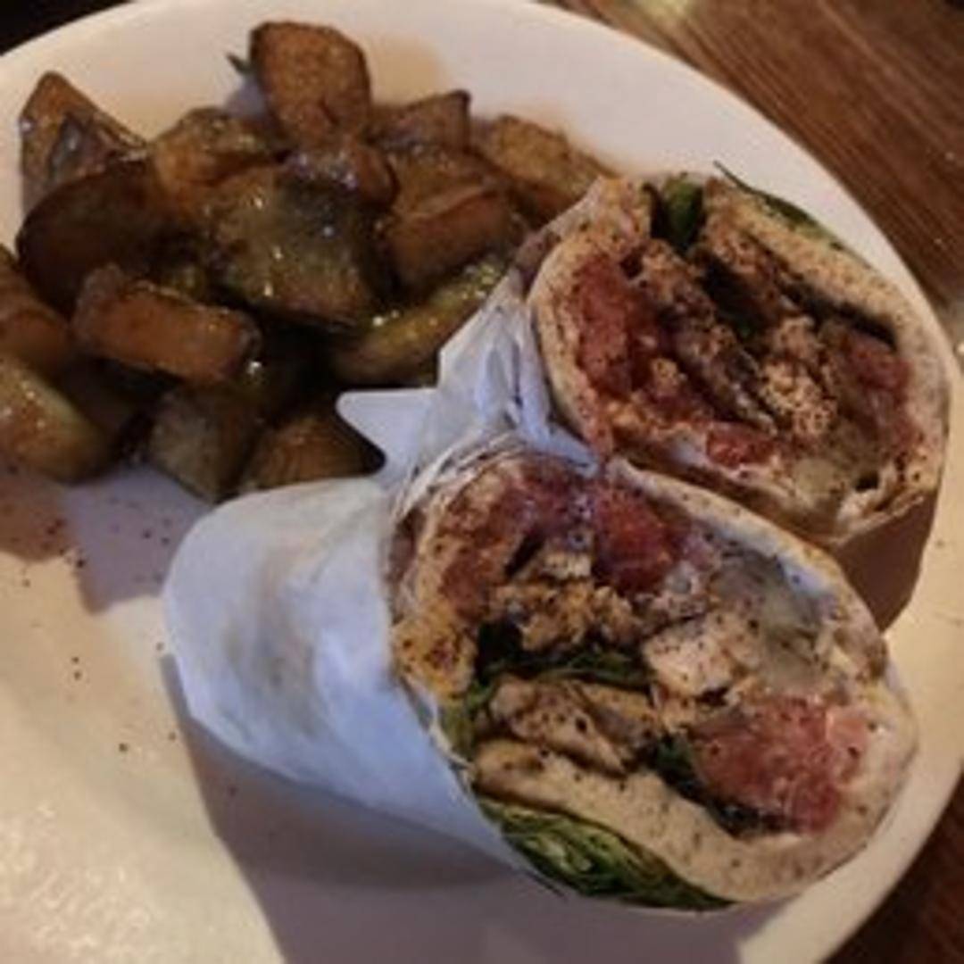 Thinly sliced, seasoned meat (lamb, beef, or a combination) roasted on a vertical spit and shaved into a warm pita. Topped with lettuce, tomatoes, onions, and a creamy tzatziki sauce.
