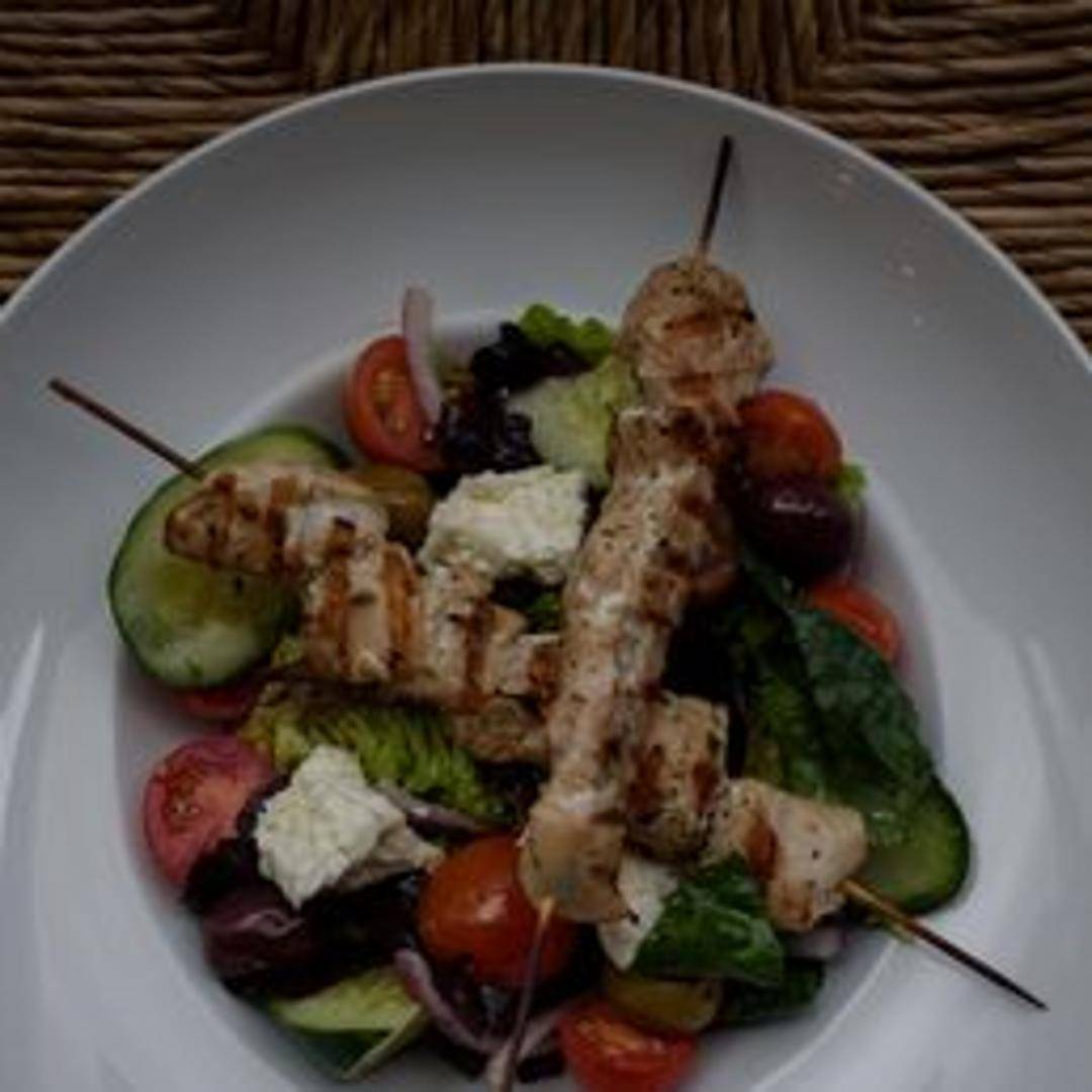 A refreshing salad featuring crisp romaine lettuce, ripe tomatoes, cucumbers, Kalamata olives, red onion, and feta cheese, tossed in a tangy Greek vinaigrette.