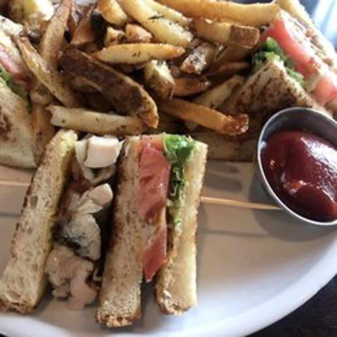 Grilled chicken breast, crispy bacon, cheddar cheese, lettuce, tomato, and mayonnaise served on toasted bread. A classic club sandwich with a smoky, wood-grilled flavor.