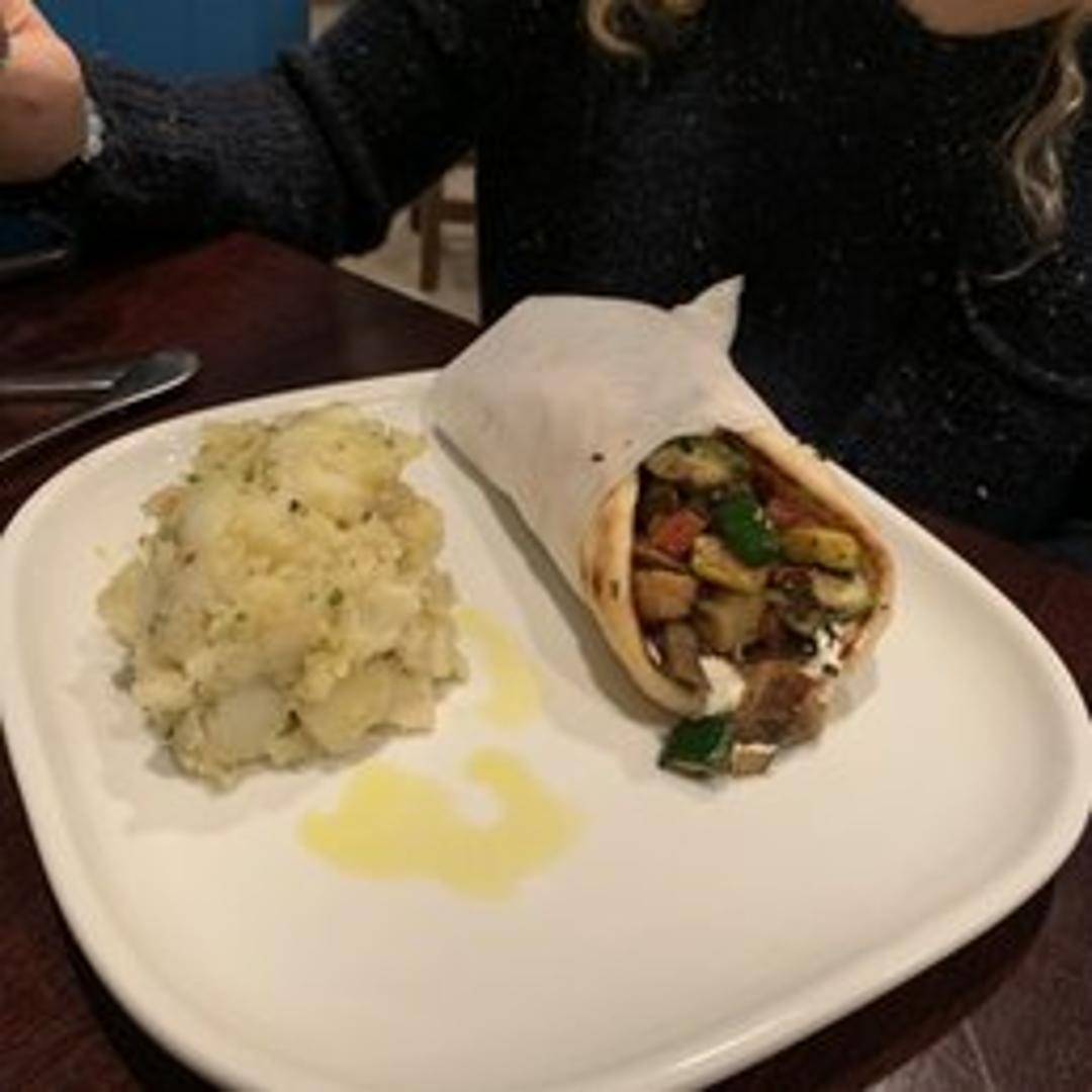 Grilled halloumi cheese, roasted red peppers, tomatoes, onions, and mixed greens wrapped in warm pita bread. Topped with our house-made tzatziki sauce.