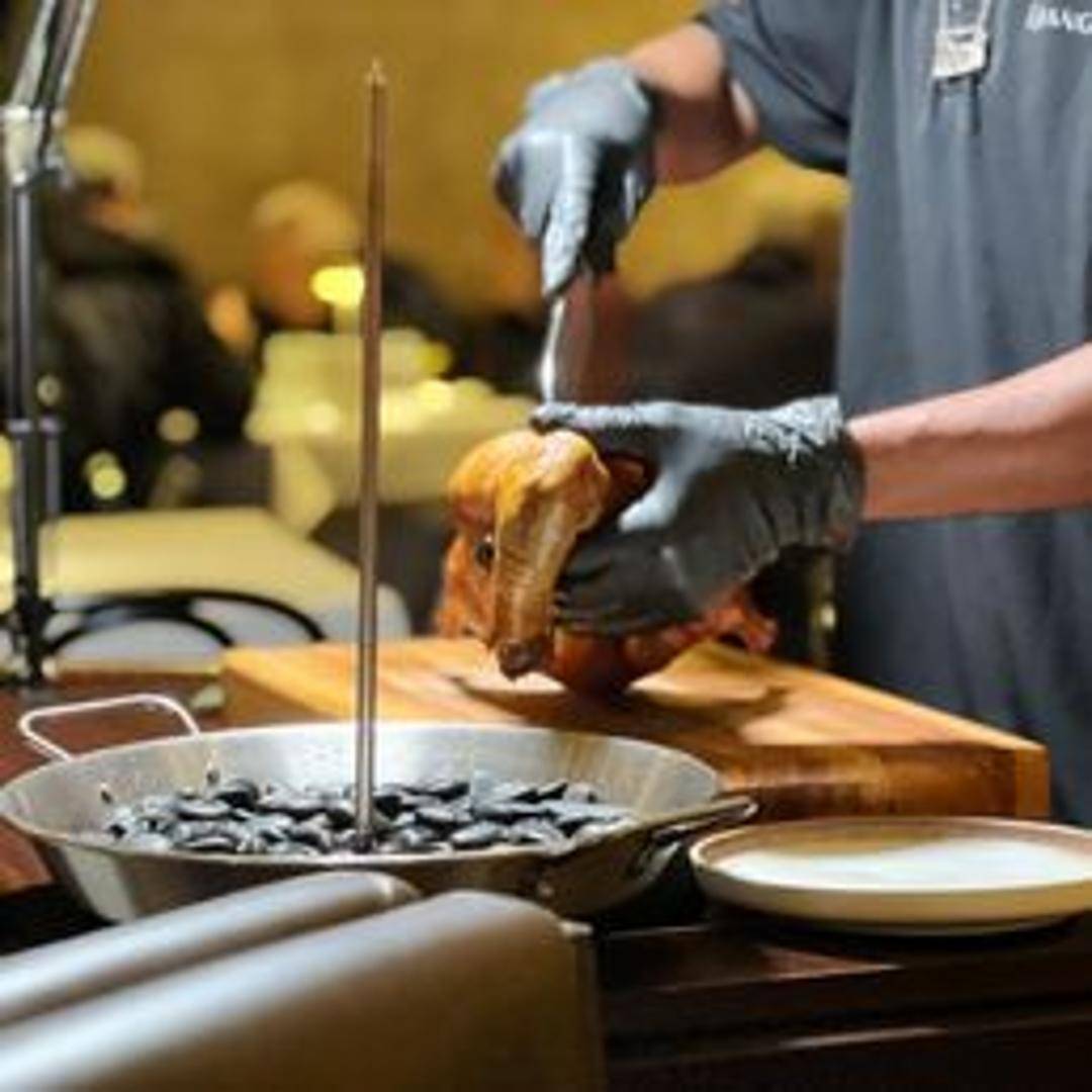 Crispy-skinned roasted duck, carved and served with thin pancakes, scallions, and sweet bean sauce. A classic Northern Chinese dish, known for its perfectly rendered fat and flavorful meat. The skin is prized for its shattering crispness. The duck is traditionally carved tableside.