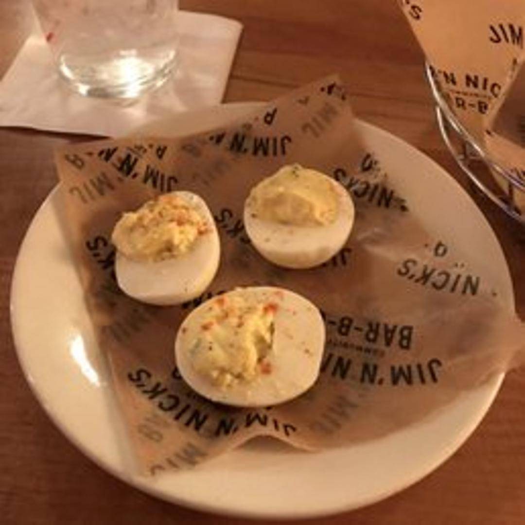 Delight in the classic comfort of Jim 'N Nick's Deviled Eggs, a beloved Southern appetizer. Each half features a perfectly cooked egg white cradling a creamy, rich yolk filling, expertly blended with a hint of tang and savory spices. Garnished simply, these cool and flavorful bites offer a refreshing contrast to the hearty BBQ, making them a perfect complement to any meal.