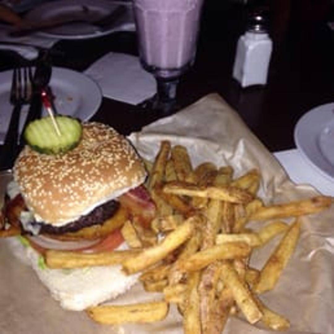 A juicy burger topped with melted cheddar cheese, crispy bacon, fried onion strings, and tangy BBQ sauce. Served on a toasted brioche bun with lettuce, tomato, and a side of your choice.