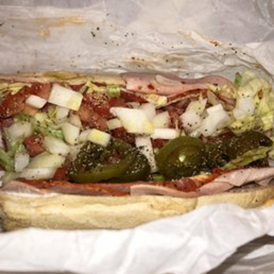A classic Italian sub piled high with assorted Italian cold cuts such as salami, prosciutto, and provolone cheese. Topped with lettuce, tomato, onion, and a drizzle of Italian dressing on a freshly baked sub roll.