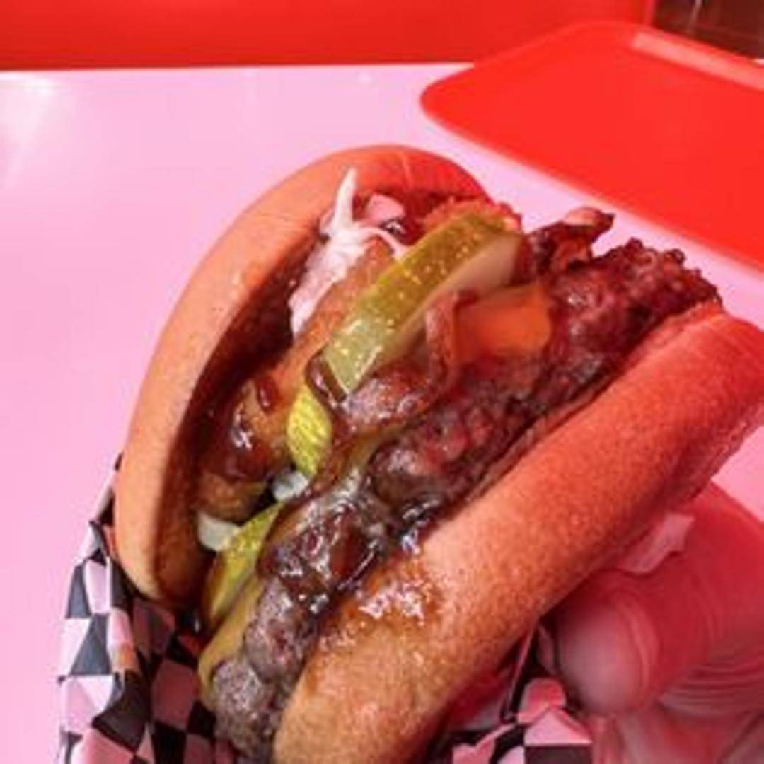 A juicy beef patty topped with crispy bacon, melted cheese, lettuce, tomato, onion, and your choice of condiments on a toasted bun.