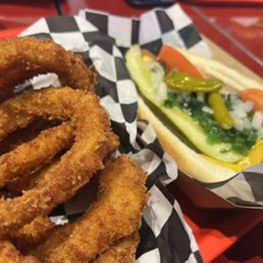 A classic Chicago-style hot dog on a poppy seed bun, topped with yellow mustard, chopped white onions, bright green sweet pickle relish, a dill pickle spear, tomato wedges or slices, pickled sport peppers, and a dash of celery salt.