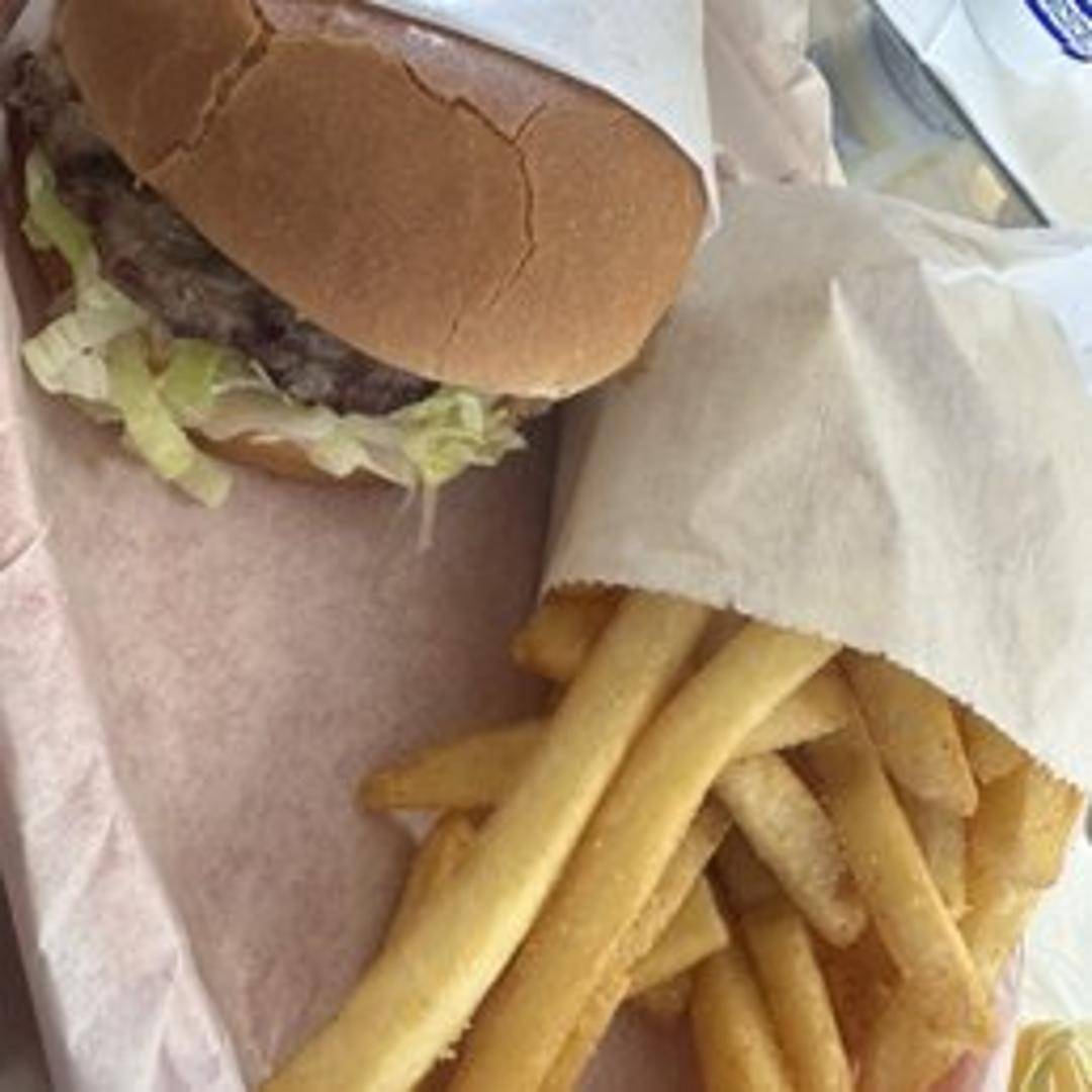 A large burger loaded with toppings. Includes lettuce, tomato, onion, pickles, cheese, bacon, and your choice of condiments. Served with french fries and a drink.