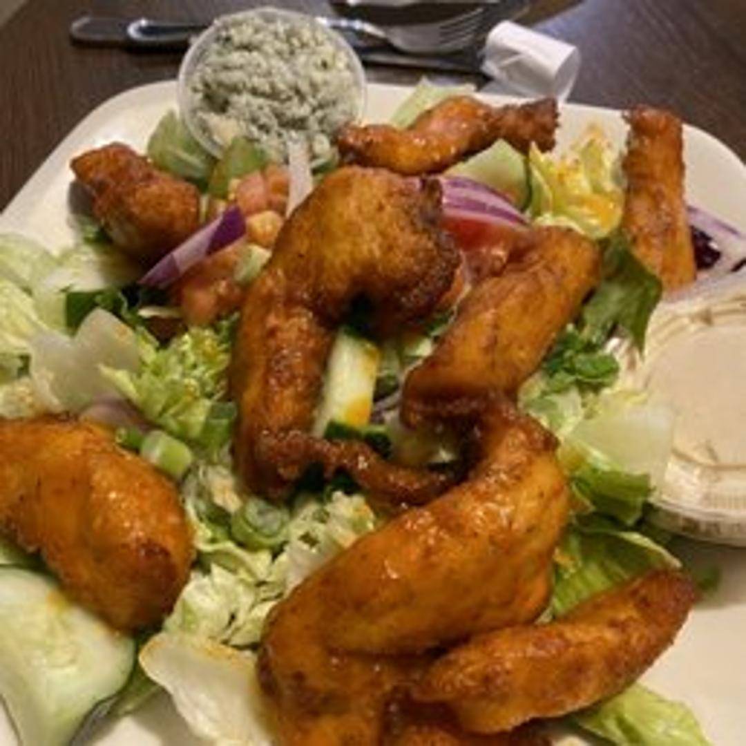 Crispy or grilled chicken tossed in buffalo sauce served atop a bed of mixed greens with diced tomatoes, crumbled bleu cheese, shredded cheddar cheese, and your choice of dressing.