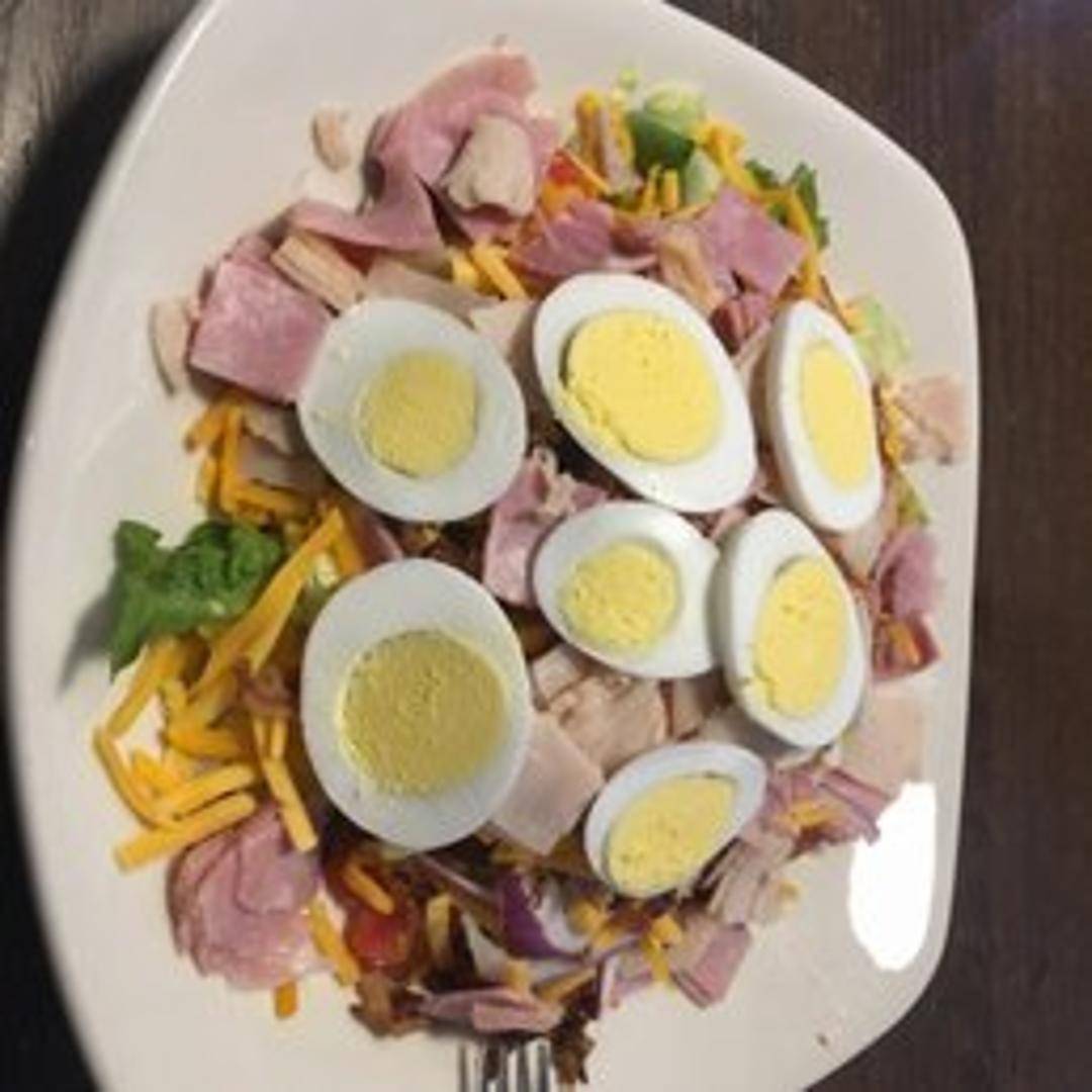 A generous mix of crisp lettuce, topped with sliced ham, turkey, and Swiss and American cheeses. Includes hard-boiled egg, tomatoes, cucumbers, and your choice of dressing.