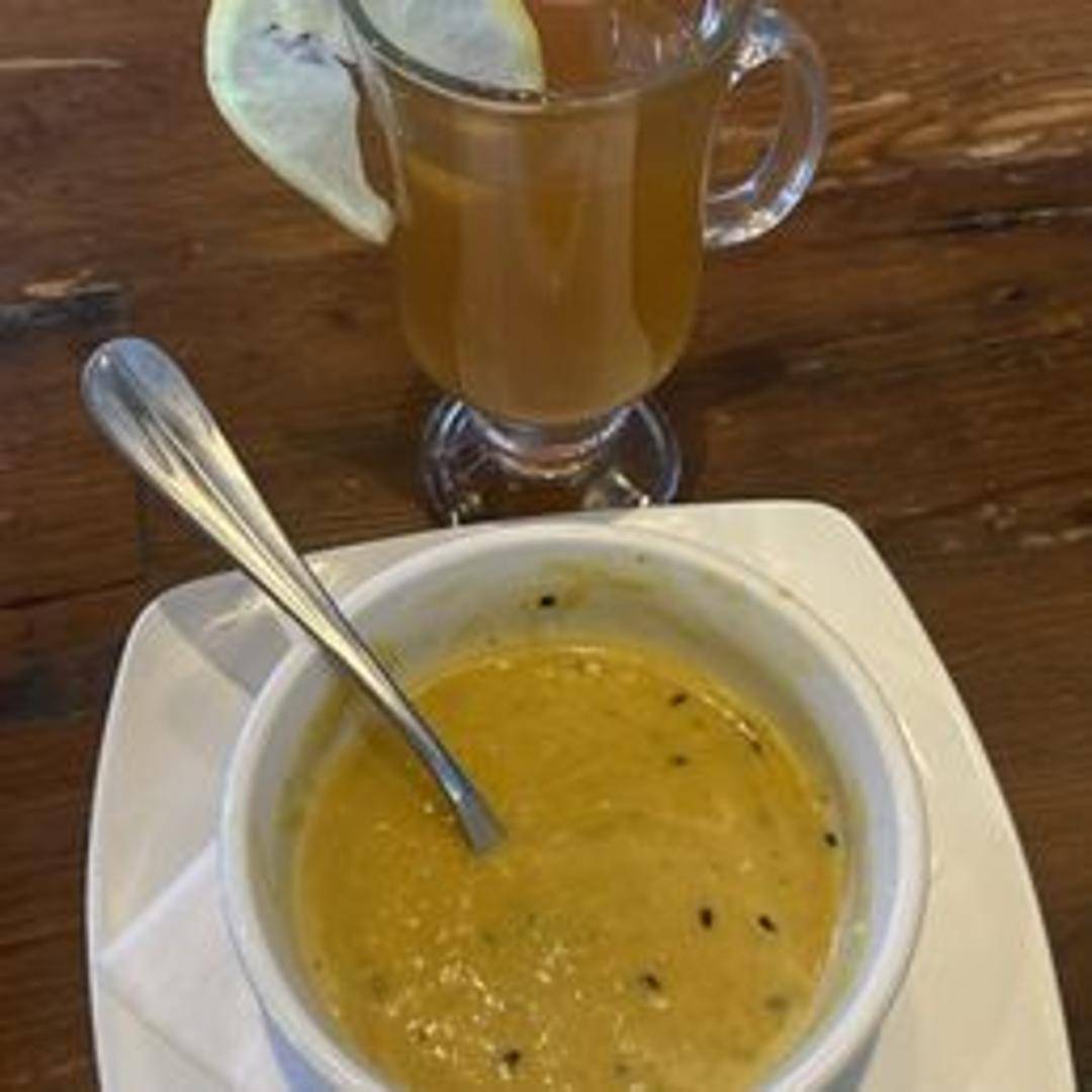 A velvety smooth and naturally sweet soup featuring roasted butternut squash, blended with vegetable stock, cream, and a touch of warming spices like nutmeg and cinnamon. Topped with toasted pumpkin seeds and a drizzle of maple syrup.