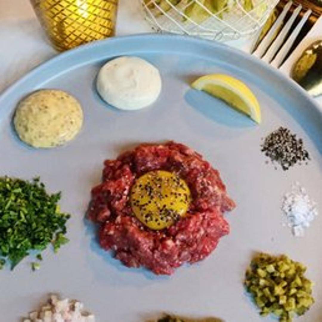 Hand-cut raw beef tenderloin, finely diced and mixed with classic seasonings, capers, shallots, Dijon mustard, and a raw egg yolk. Served with grilled baguette slices.