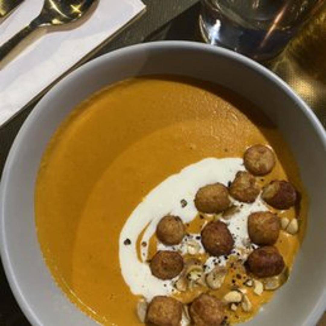 A smooth and creamy tomato soup, typically made with roasted tomatoes, vegetable broth, cream, and herbs, often garnished with basil or a swirl of cream.