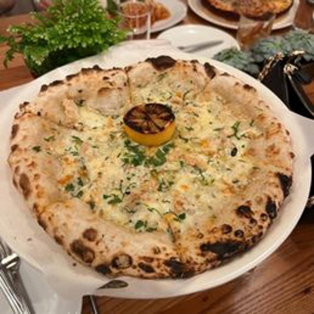 Josephine's signature clam pizza features a crispy crust topped with a creamy white sauce, fresh shucked clams, garlic, oregano, and a sprinkle of parmesan cheese. Baked to perfection for a savory and unforgettable taste. Prepared fresh daily by Josephine.