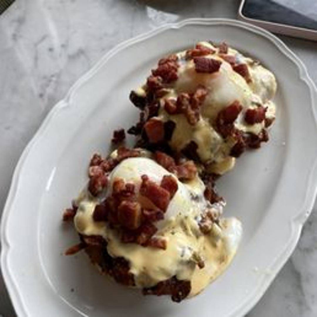 Classic Eggs Benedict featuring poached eggs and hollandaise sauce atop toasted English muffins and sliced ham.