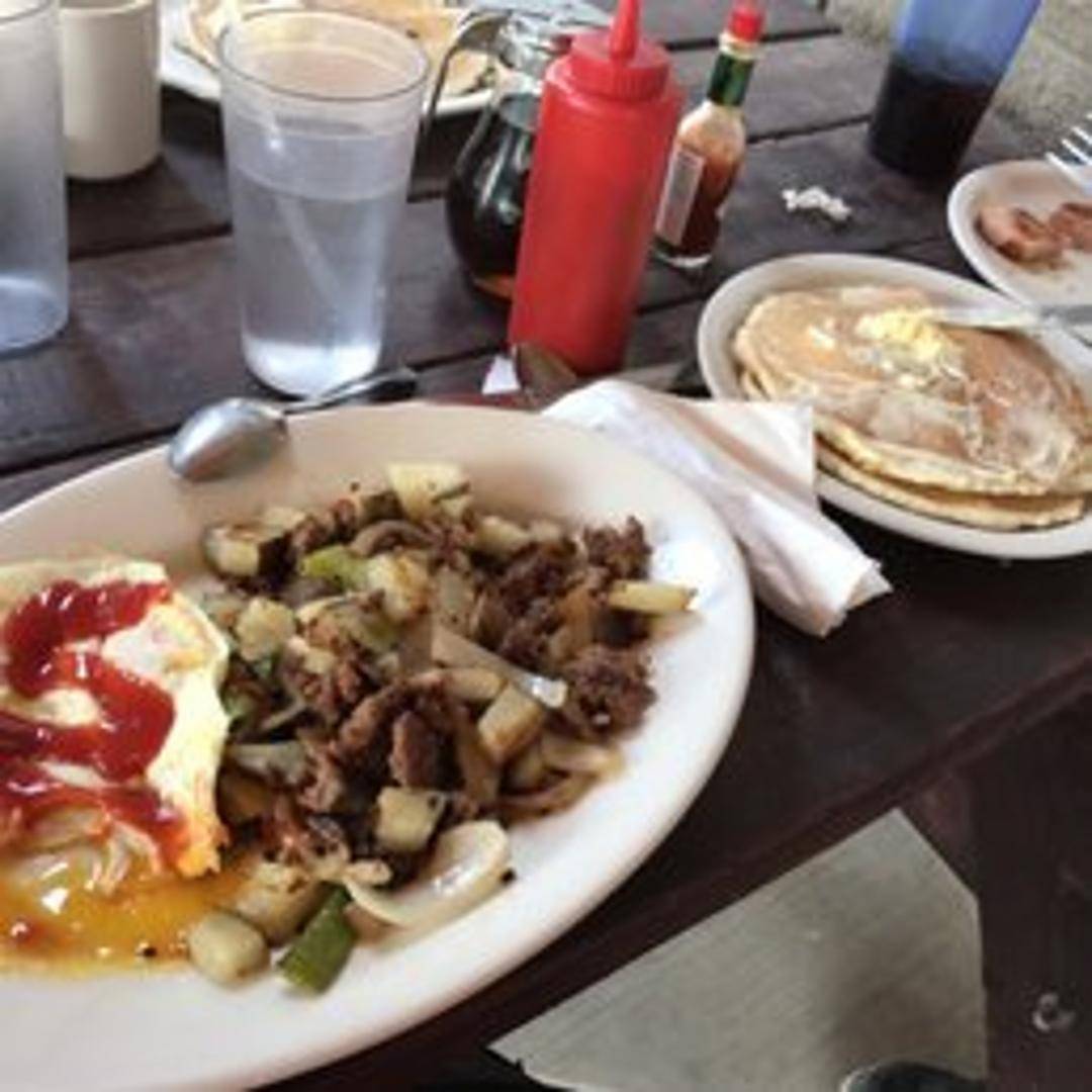 Two eggs cooked to your liking, choice of bacon, sausage, or ham, served with your choice of toast or pancakes, and a side of crispy hash browns.