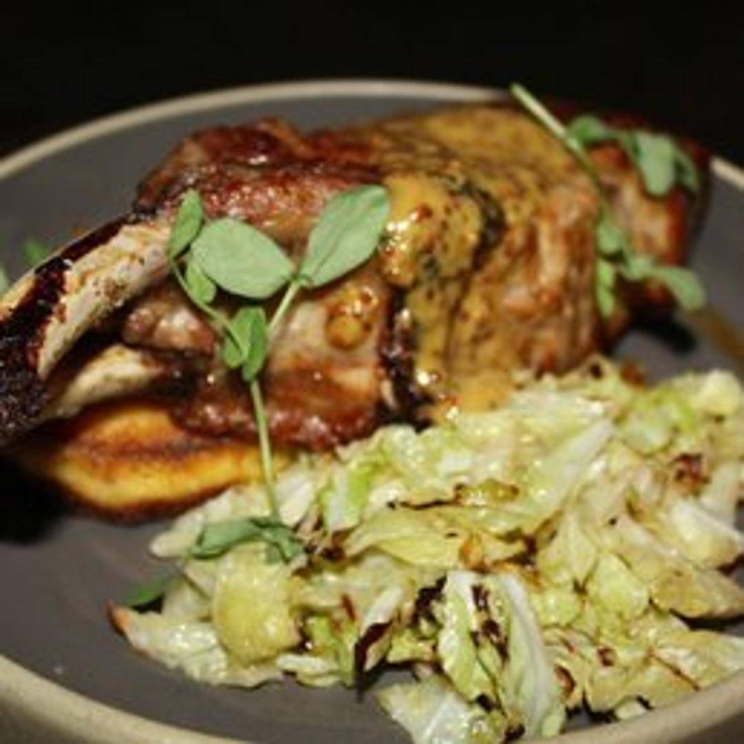 Grilled or pan-seared pork chop, seasoned with herbs and spices, often served with seasonal vegetables or a savory sauce.