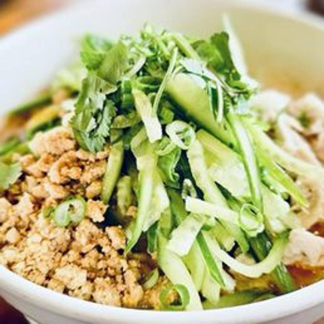 Savory and spicy noodles with a rich sesame-peanut sauce, ground pork, preserved vegetables (such as Sichuan preserved mustard greens or ya cai), chili oil, and scallions. Garnished with peanuts for added texture and flavor.