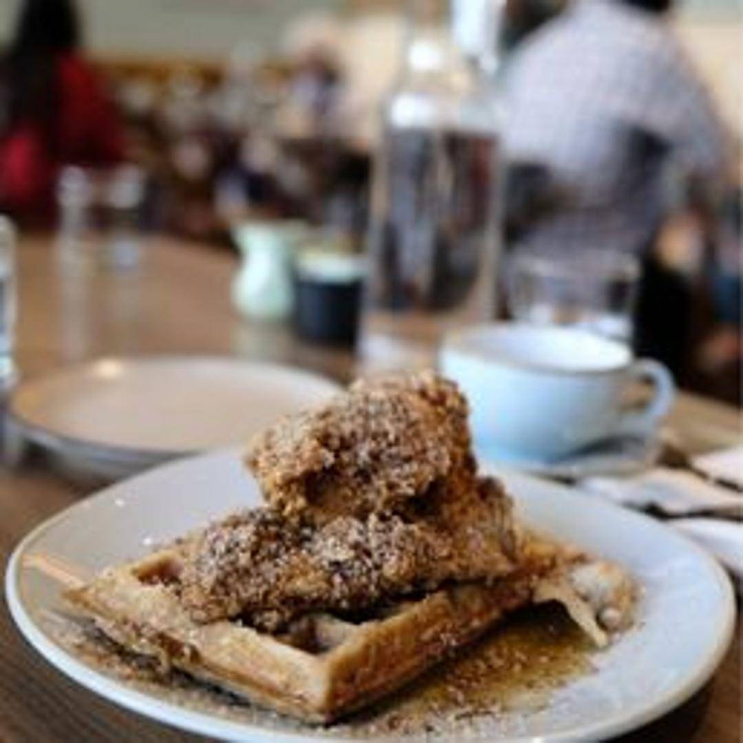 Crispy, golden-fried chicken served atop fluffy, golden waffles. Paired with a generous drizzle of sweet maple syrup and a pat of butter for a classic sweet and savory indulgence.