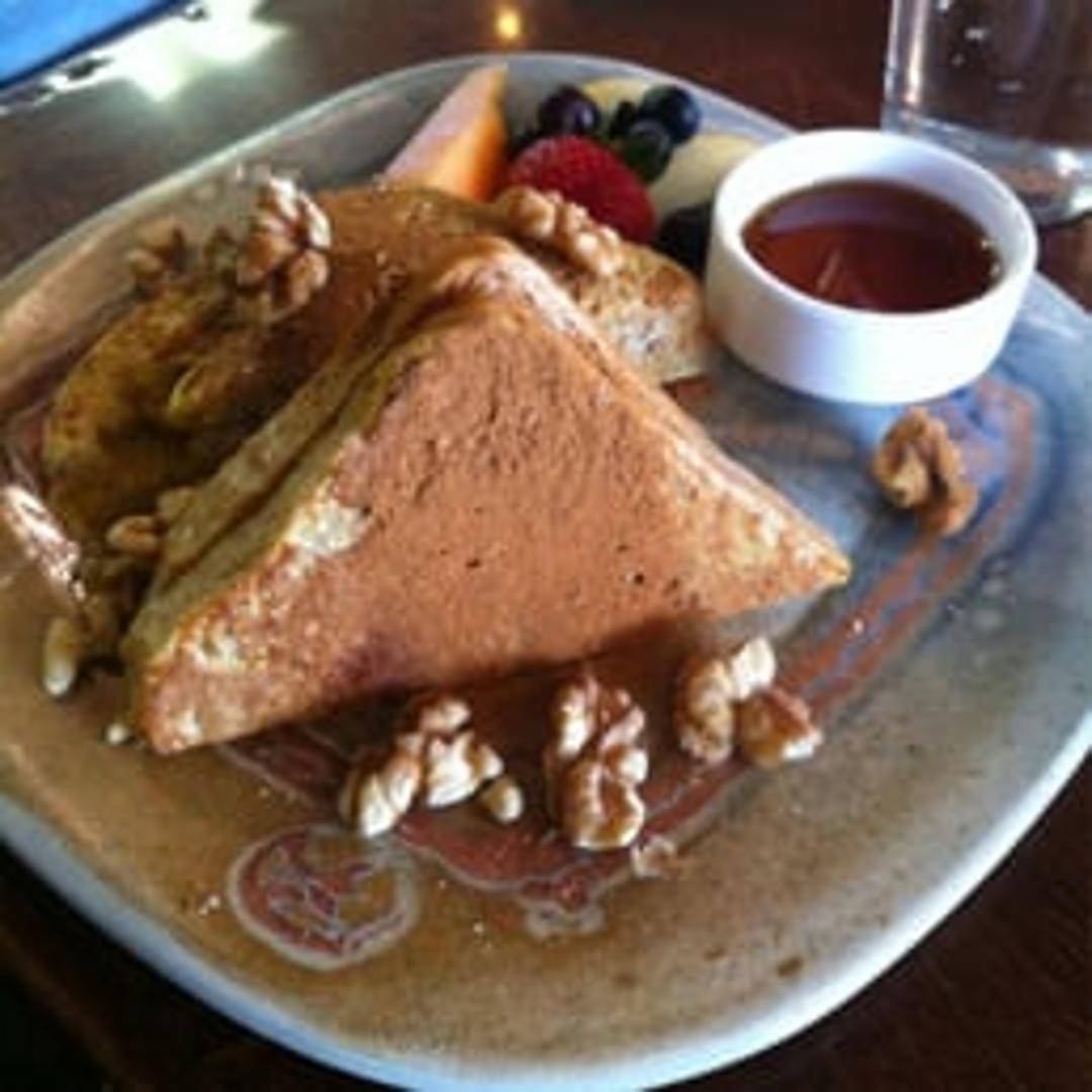 Thick slices of challah bread, stuffed with a sweet cream cheese filling and topped with fresh fruit and a dusting of powdered sugar. Served with maple syrup.