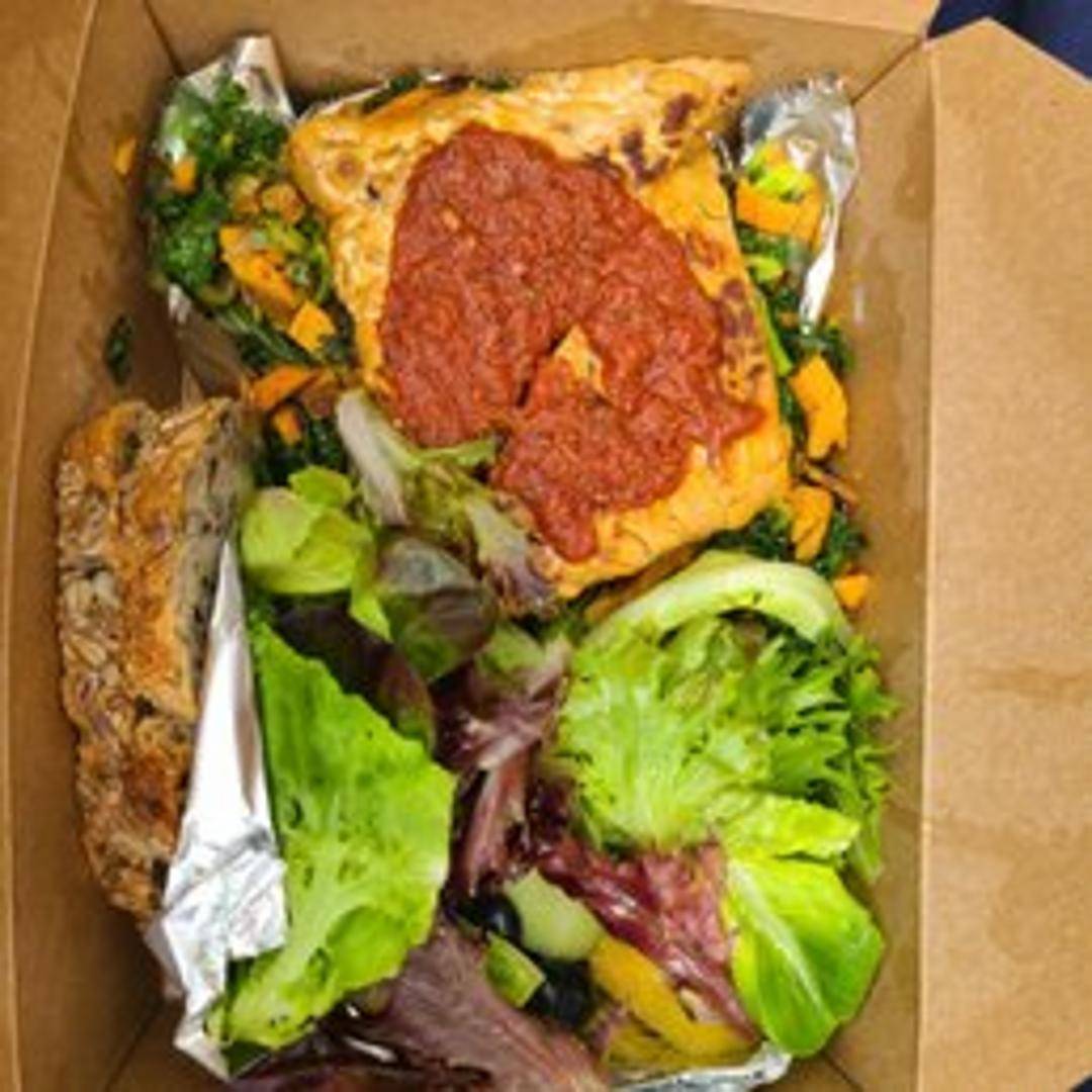 Marinated tempeh, baked to perfection. Served with a savory sauce and your choice of two sides.