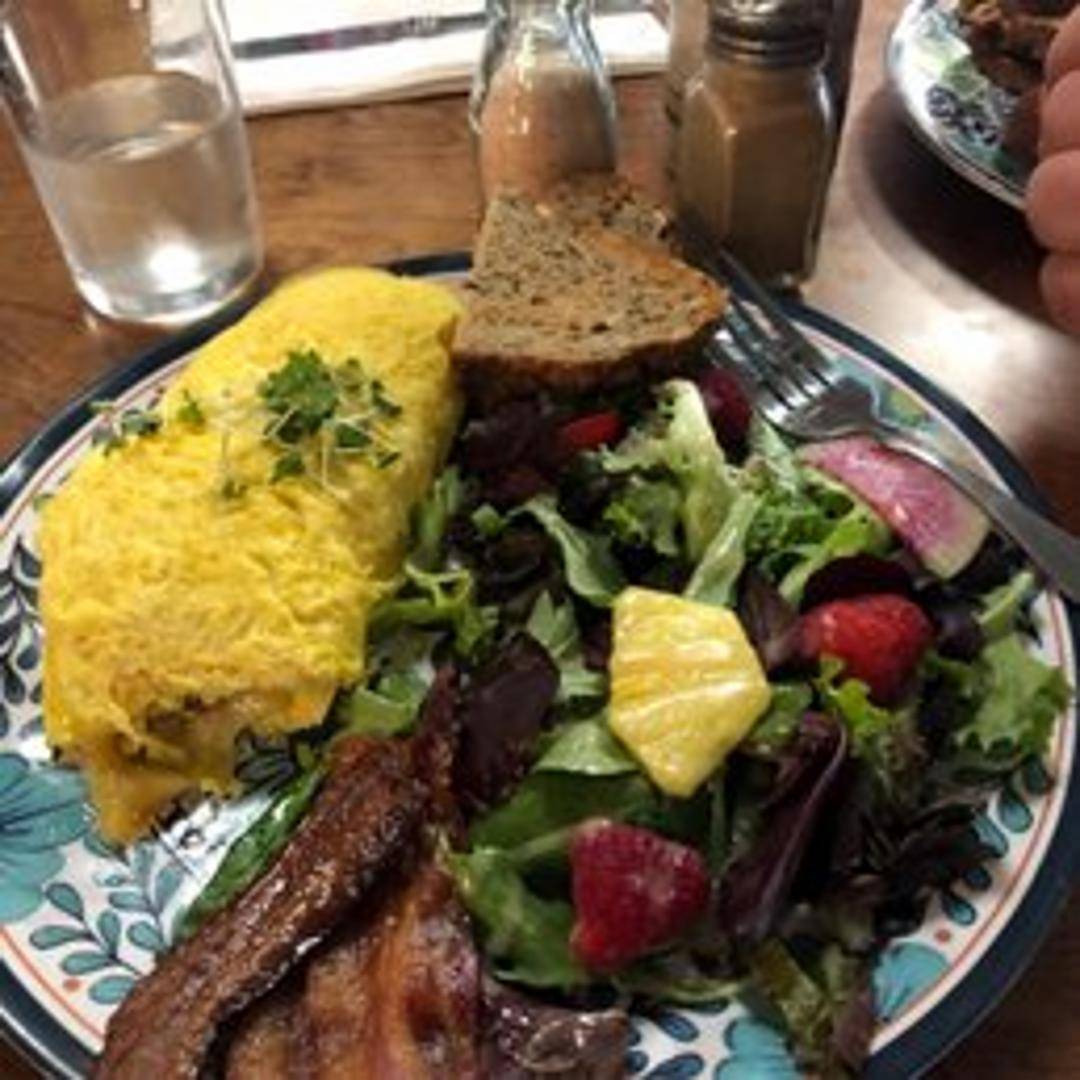 A hearty breakfast platter showcasing regional or local ingredients, potentially including eggs, potatoes, meat, and a side of toast or pancakes.