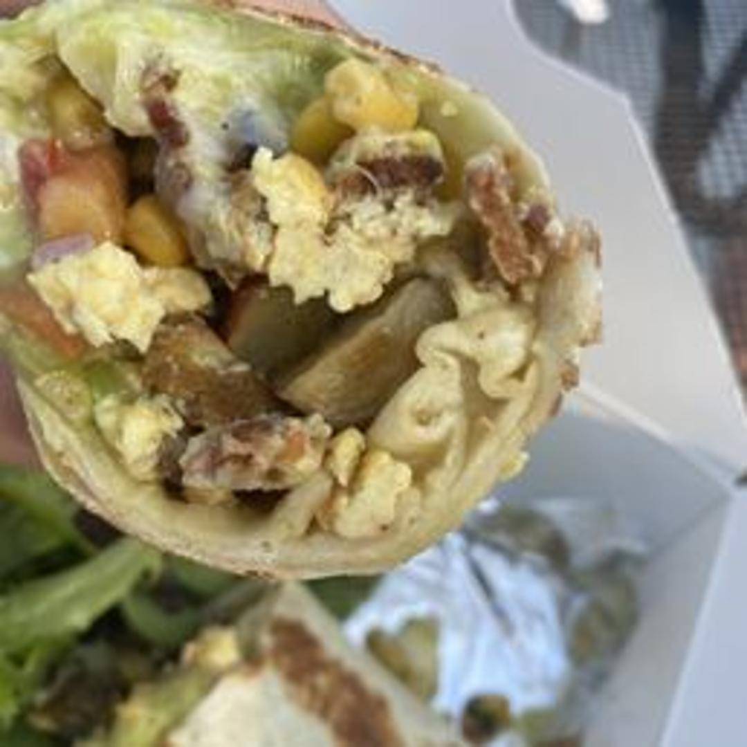 A large flour tortilla filled with scrambled eggs, cheese, potatoes, and your choice of meat or vegetables. Served with salsa.