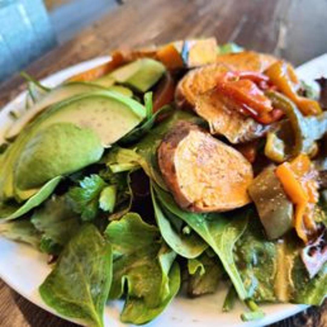 A vibrant and healthy salad featuring a medley of roasted seasonal vegetables and creamy avocado. Dressed with a light vinaigrette.