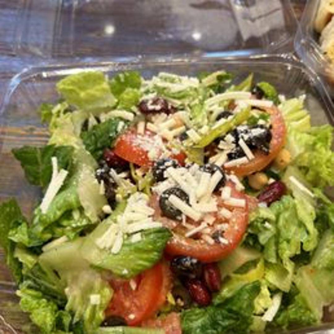 A refreshing blend of crisp romaine lettuce, tomatoes, cucumbers, red onion, black olives, and pepperoncini. Tossed in our house Italian dressing.