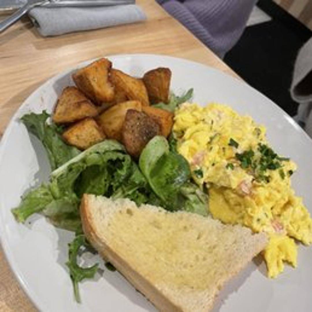 Fluffy scrambled eggs made with fresh, locally sourced eggs. Prepared with butter and seasoned with salt and pepper. Available plain or with add-ins like cheese, herbs, or vegetables.