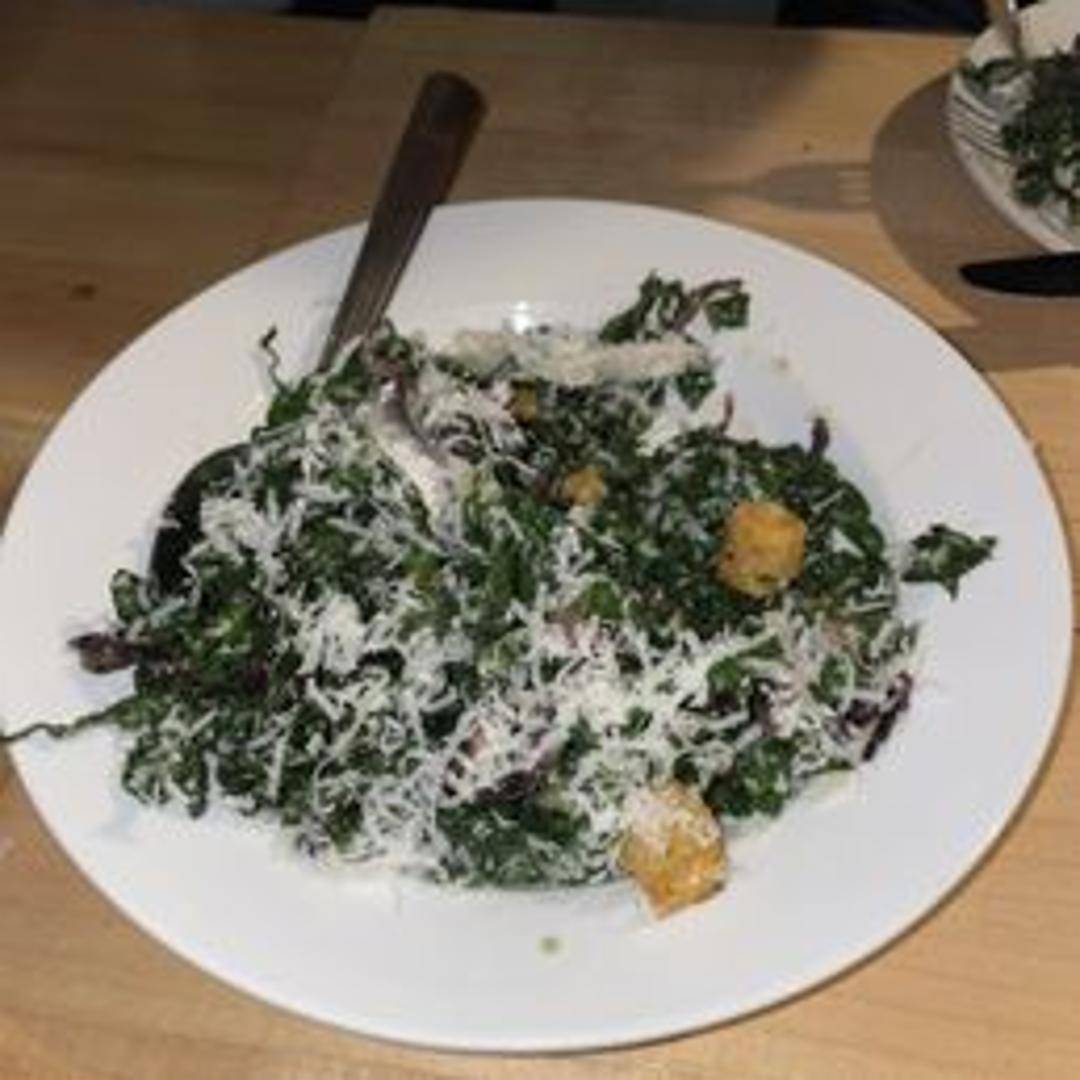 A hearty and flavorful salad featuring fresh kale, tossed in a creamy Caesar dressing. Often includes parmesan cheese, croutons, and sometimes other toppings like grilled chicken or chickpeas.