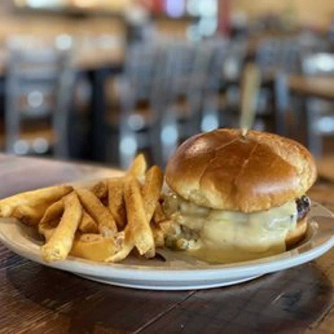 A flavorful burger piled high with thinly sliced steak, grilled onions, peppers, and melted provolone cheese. Served on a toasted bun.