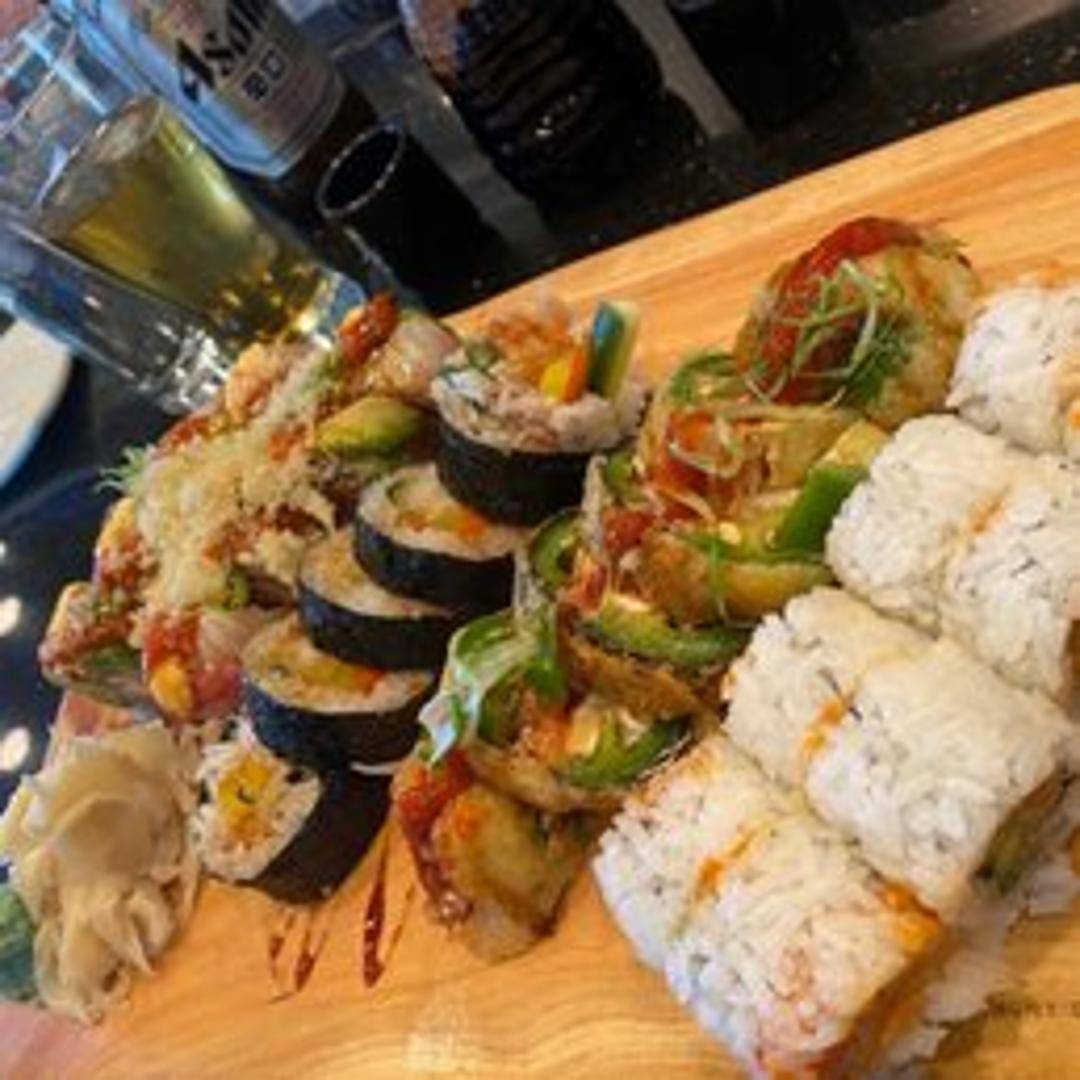 Eel and avocado roll with sesame seeds, cut into 8 pieces.