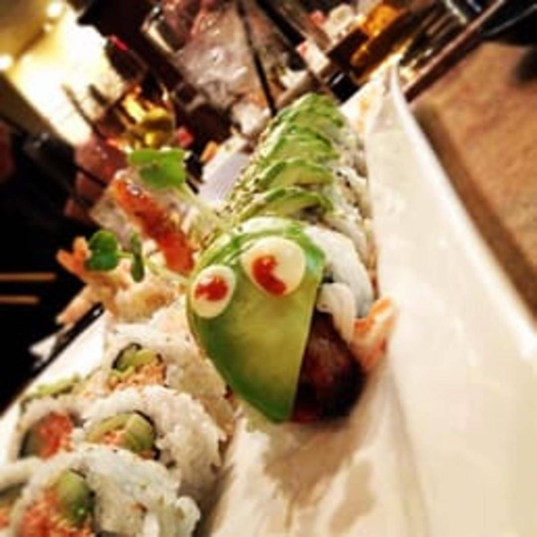 Eel and cucumber roll topped with avocado and drizzled with eel sauce, cut into 8 pieces.