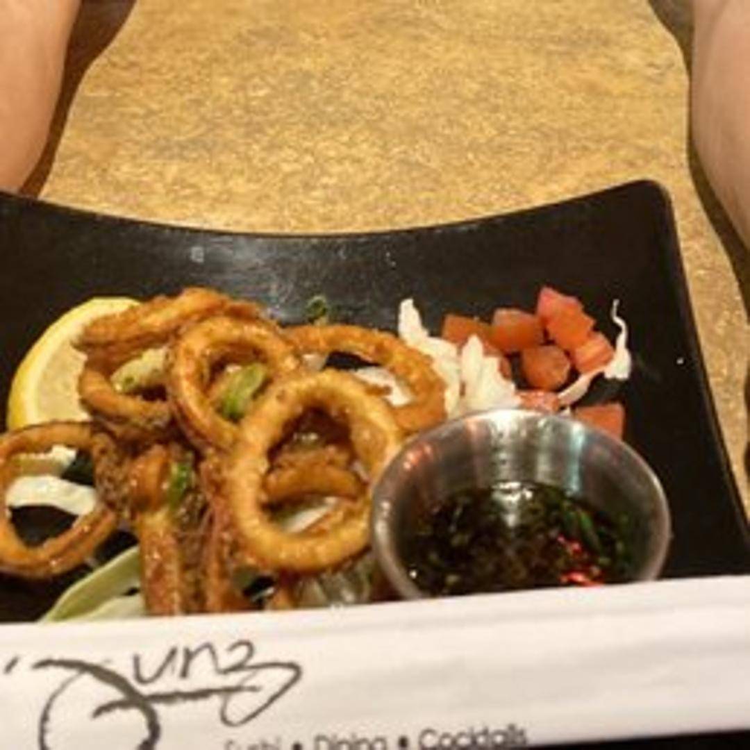 Lightly battered and fried calamari rings, served with a dipping sauce.