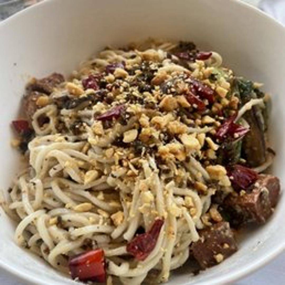 A vibrant and iconic Sichuan dish featuring springy wheat noodles coated in a rich, complex sauce. This signature sauce balances spicy chili oil, numbing Sichuan peppercorns, savory ground pork, and preserved vegetables, creating a symphony of bold flavors and textures.