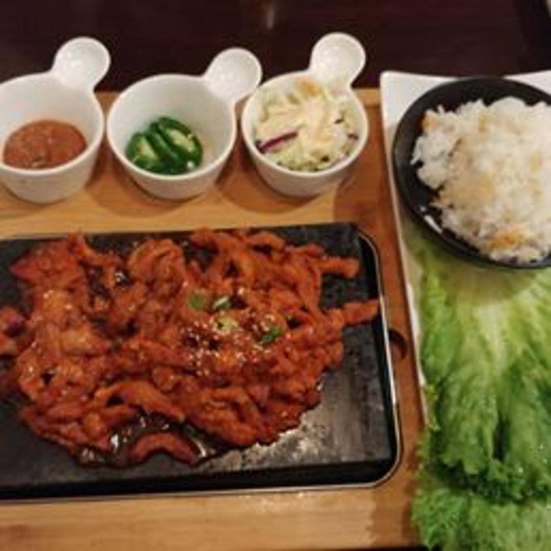 A choice of savory pork belly or spicy marinated pork served with rice, kimchi, and a variety of Korean side dishes.
