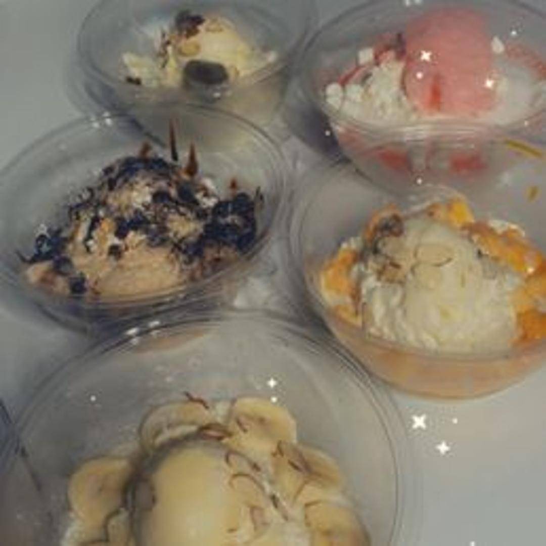A shaved ice dessert topped with fresh banana slices, sweet condensed milk, and other traditional Bingsu toppings.