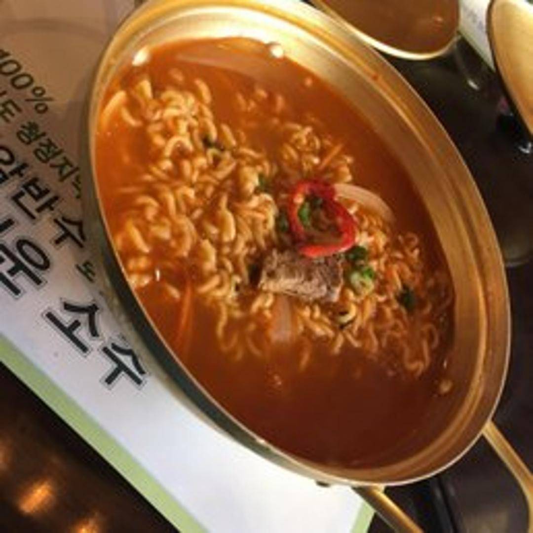 Korean ramen noodles in a rich broth, topped with savory beef, melted cheese, and vegetables.