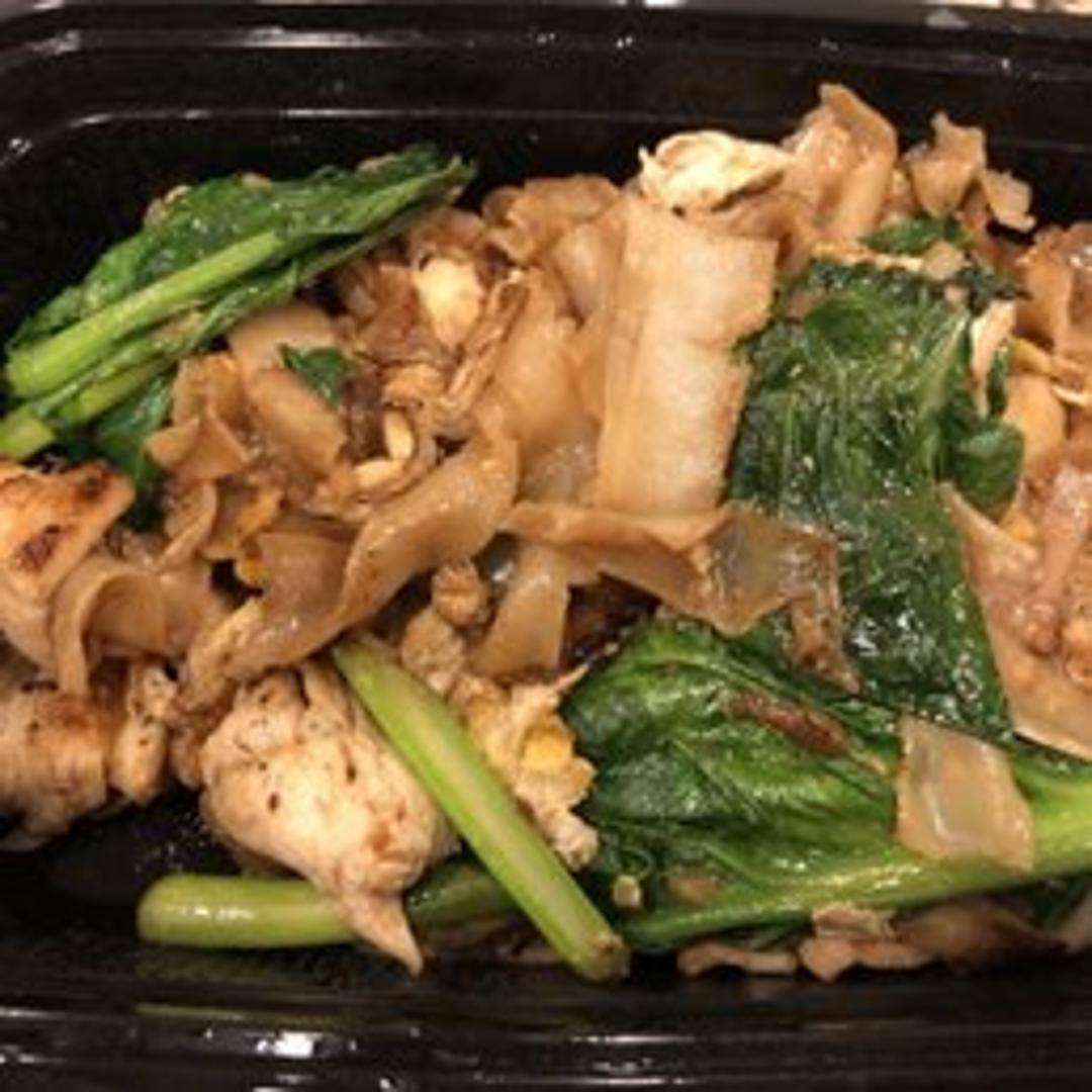 Wide rice noodles stir-fried with Chinese broccoli, egg, and a savory sweet soy sauce.
