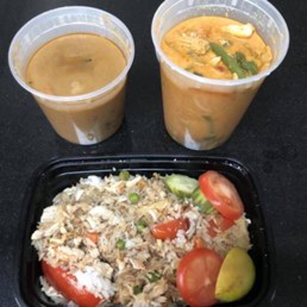 A rich and aromatic Thai curry made with red curry paste, coconut milk, bamboo shoots, bell peppers, and Thai basil. Available with your choice of protein (chicken, pork, beef, tofu, or vegetables). Served with steamed rice.