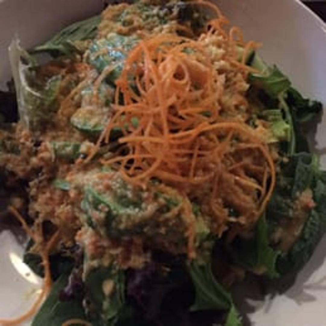 A refreshing and vibrant salad featuring creamy slices of ripe avocado atop a bed of crisp mixed greens. Drizzled with a light, savory dressing, this salad offers a perfect balance of textures and flavors, making it an ideal starter or a fresh complement to any meal.