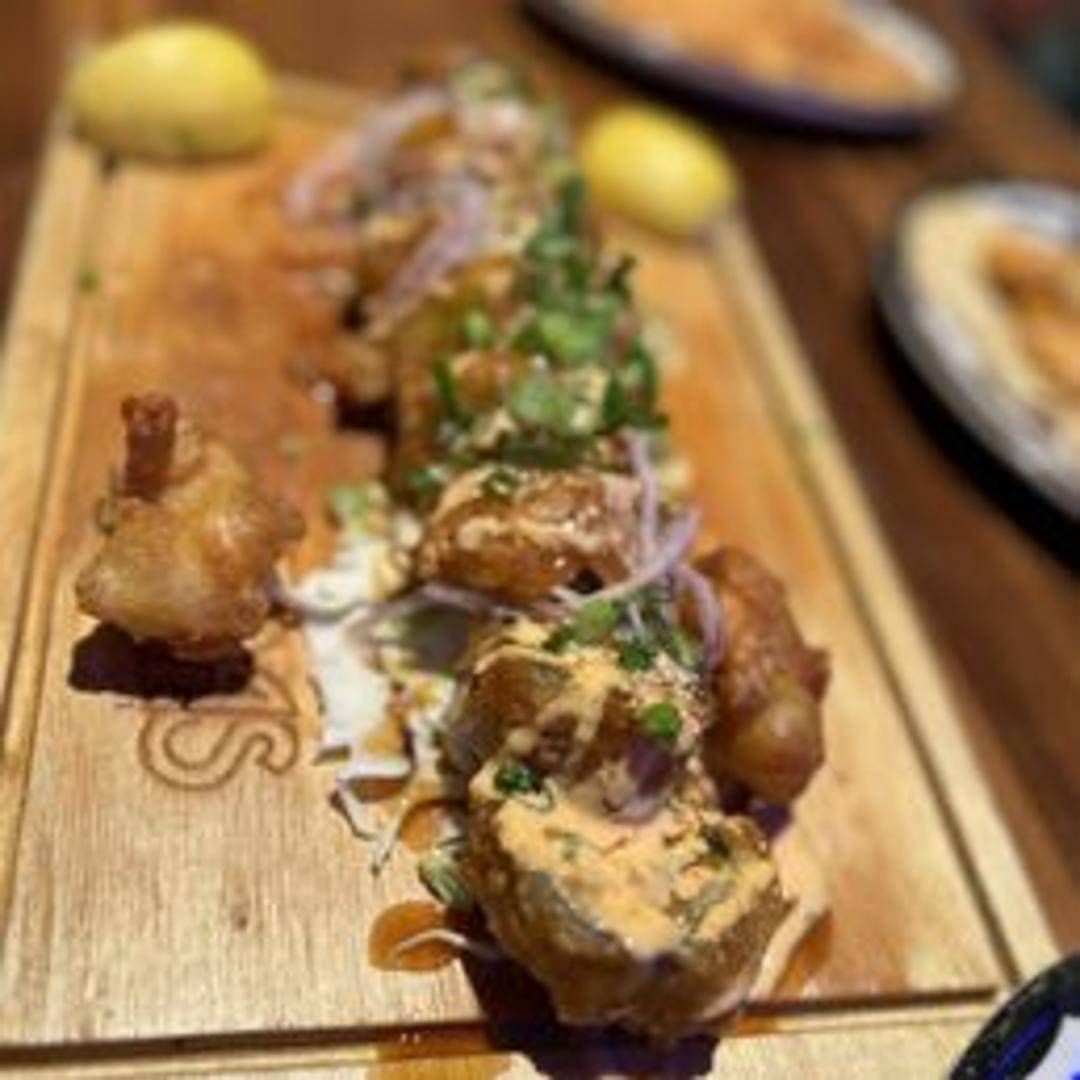 A sushi roll featuring eel and cucumber inside, topped with avocado and tobiko (flying fish roe). Often drizzled with eel sauce.