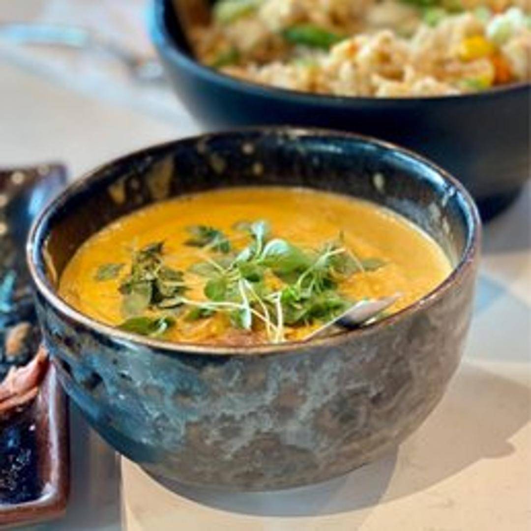 Savor the bold and fiery depths of our traditional Thai Red Curry. Prepared with a rich paste of dried red chilies, galangal, lemongrass, and other aromatic spices, simmered in luscious coconut milk, this curry delivers a robust and savory flavor with a satisfying kick. Its deep color and complex profile make it a hearty and warming choice for those who appreciate a well-balanced spice.