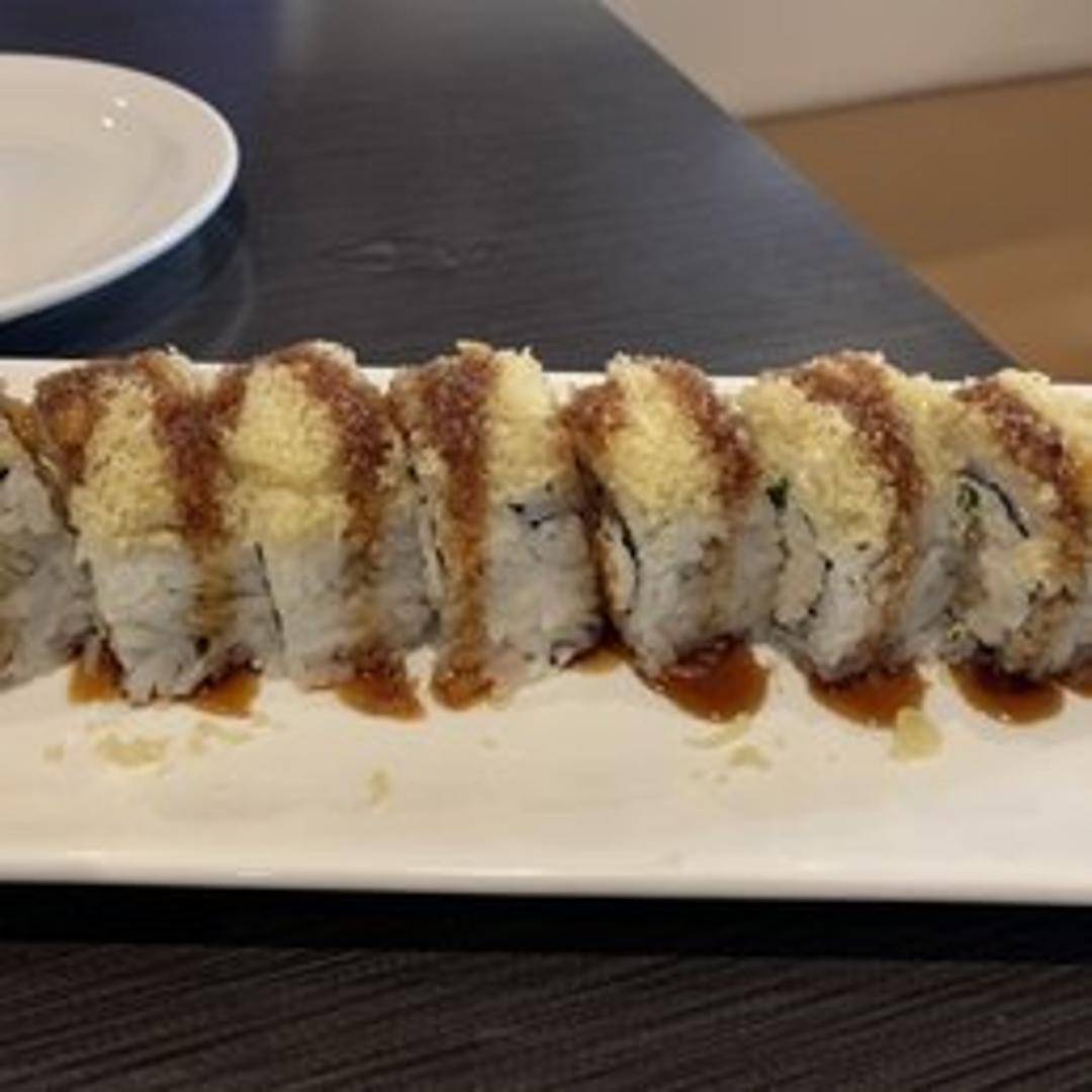 A sushi roll featuring a crispy texture, often achieved with tempura flakes or other crunchy elements. Typically includes ingredients like shrimp tempura, avocado, and cucumber.
