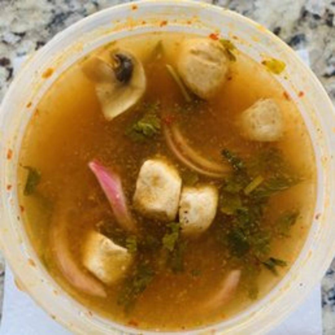 A hot and sour soup with mushrooms, tomatoes, lemongrass, galangal, lime leaves, and your choice of protein in a flavorful broth.