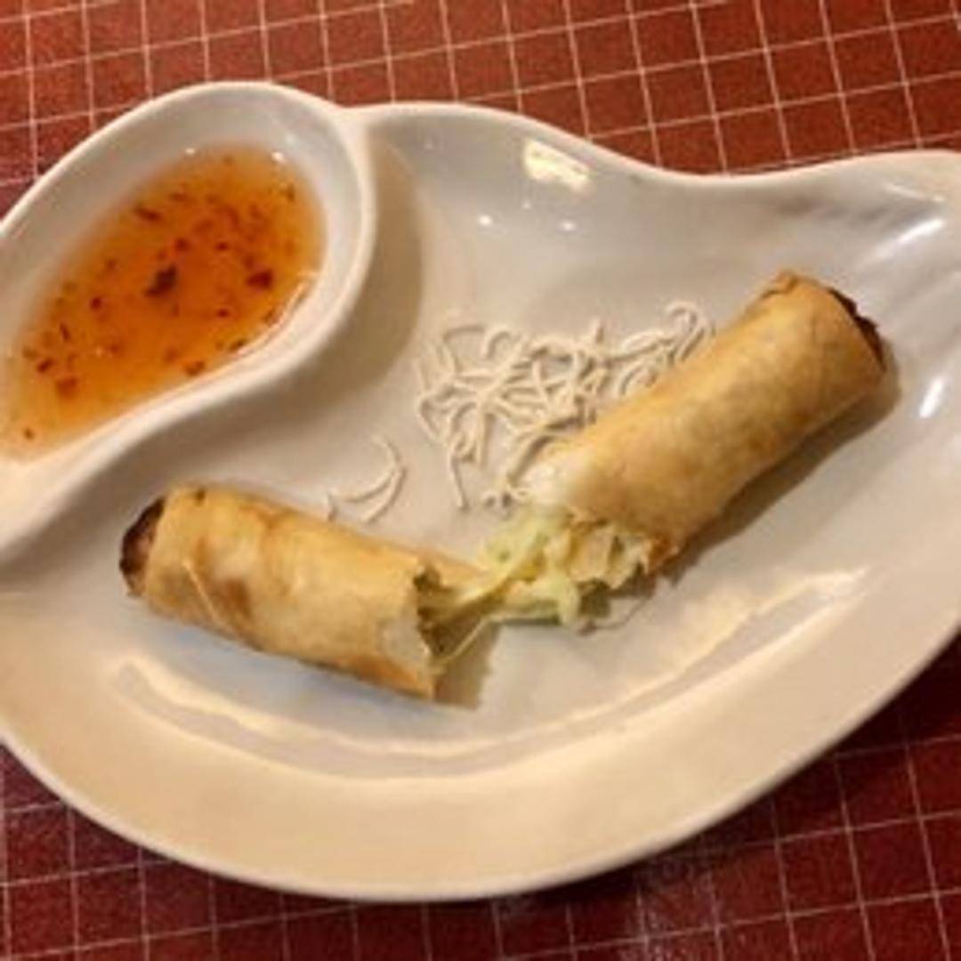 Crispy fried rolls filled with a savory mixture of vegetables and glass noodles, served with a sweet and sour dipping sauce.