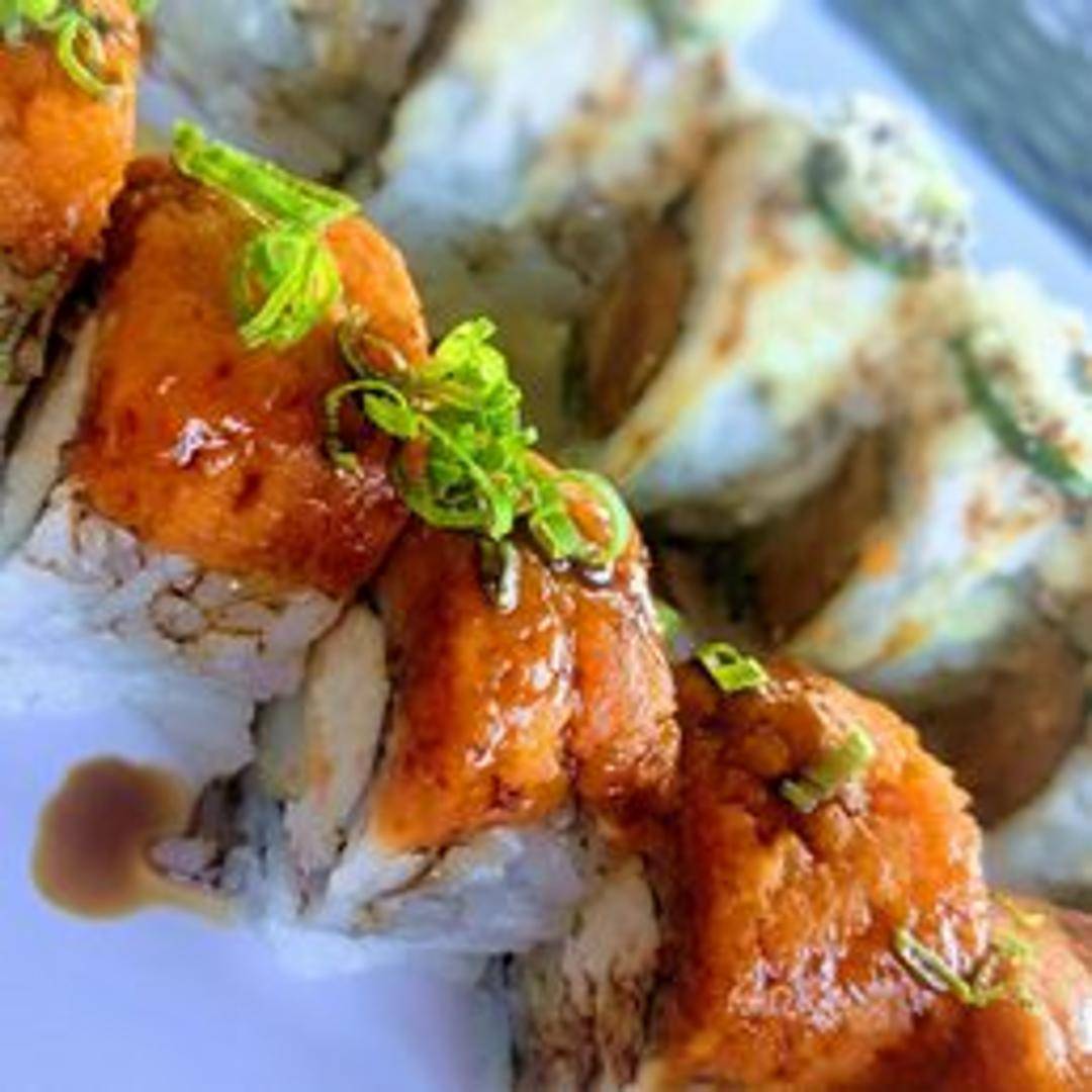 A baked or broiled sushi roll, often featuring salmon as the primary topping. May be covered in a creamy or savory sauce and then baked to create a rich, flavorful dish.