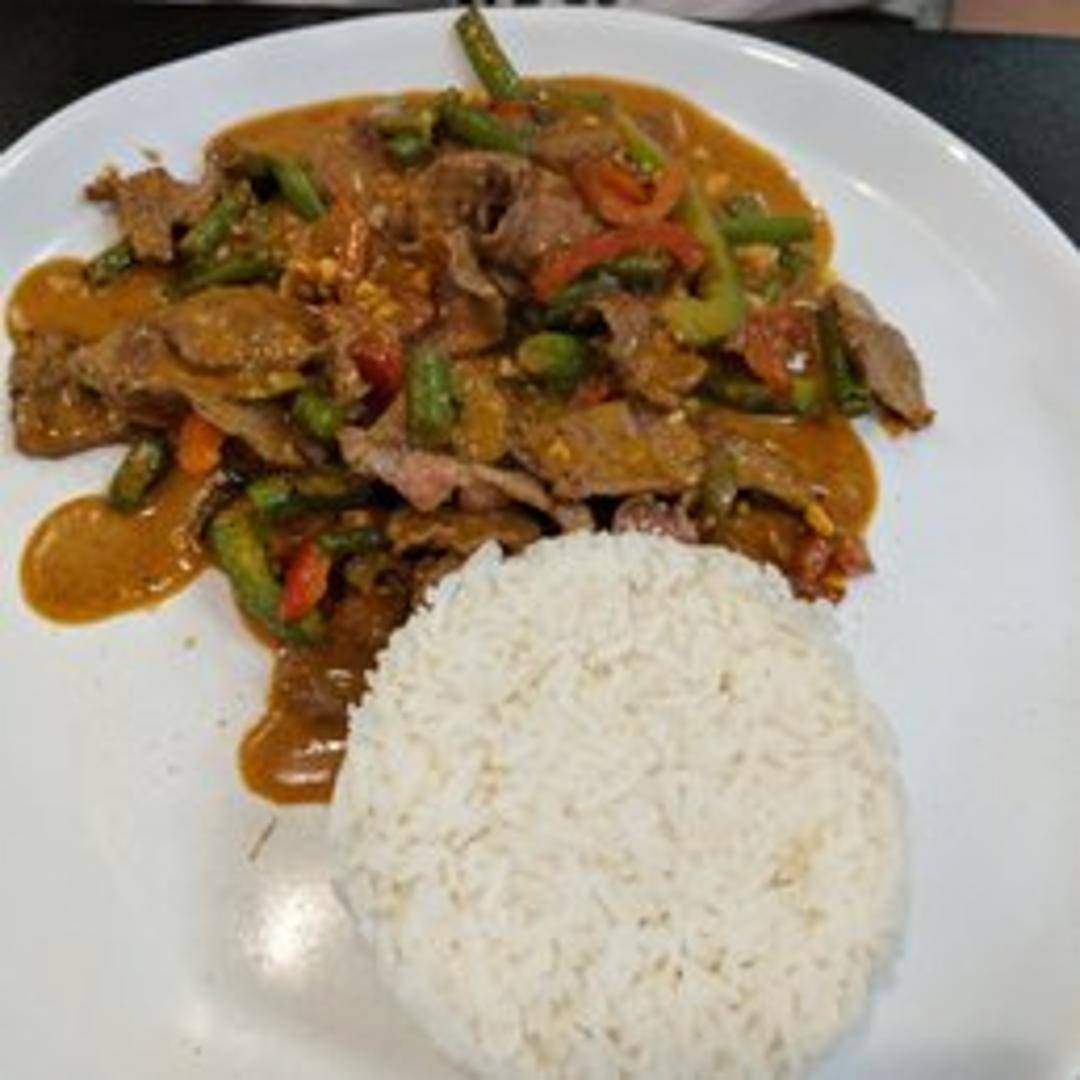 Aromatic and rich Penang curry featuring tender slices of beef slow-cooked in a thick, sweet, and savory coconut milk-based curry with kaffir lime leaves, bell peppers, and green beans. It's known for its distinct, slightly sweeter flavor compared to other Thai curries.