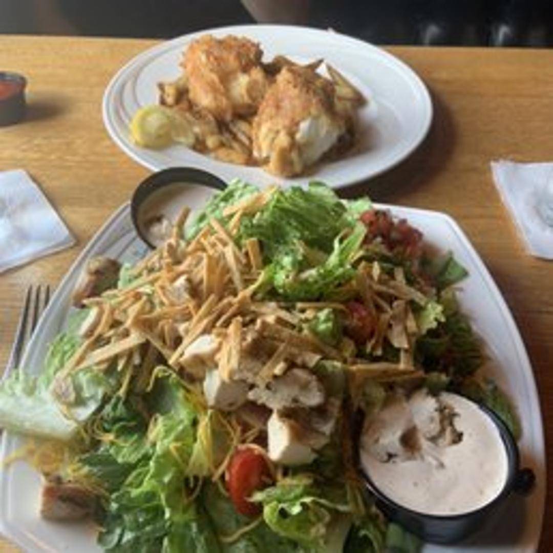 A refreshing salad featuring chopped lettuce, grilled chicken, bacon, avocado, corn, black beans, tomatoes, and a southwest-style dressing.