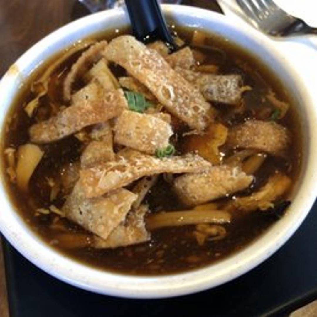 A spicy and tangy soup with tofu, wood ear mushrooms, bamboo shoots, and egg drops in a flavorful broth. A classic Chinese soup with a balance of heat and sourness.